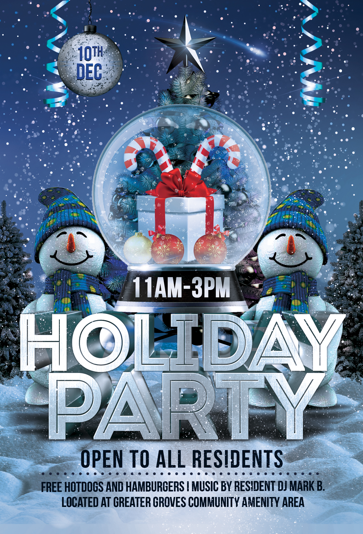Greater Groves HOA Annual Holiday Party December 10, 2022 from 11am – 3pm. Hotdogs and hamburgers will be served.