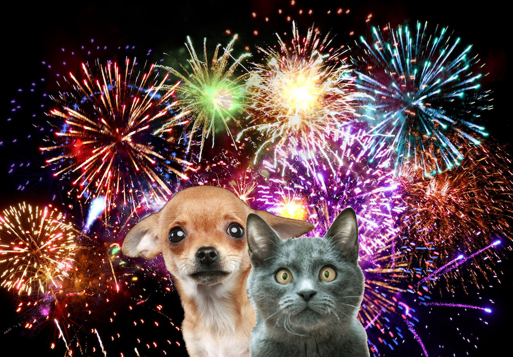 Be sure to lock doors and secure windows so there aren’t any escape routes, lower blinds to block the flashing lights, and turn on the tv or some music for calming noise. Give them plenty of exercise earlier in the day and make sure to let them use the bathroom before the firework displays ramp up after dark.